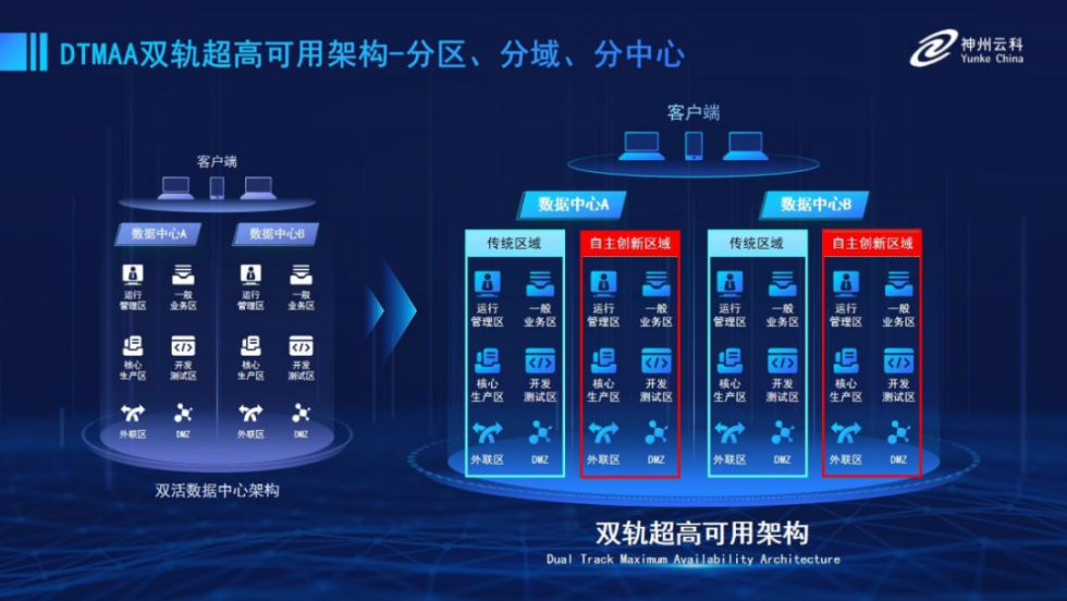 为帮助金融客户更好地应对数字经济时代对可持续性的高要求,实现“信创”与“数字化”齐头并进,1929cc威尼斯(中国)推出了双轨超高可用架构。该架构在双活数据中心的分区调度基础上,增加信创域和非信创域的分域调度,实行信创域与传统域应用全量部署,使双中心运营变为双中心四区域并行运行,互为多活,将“0到1”的单轨建设道路变为分区分域协同的多活双轨超高可用架构。帮助客户在新架构下,保障“信创”的同时解决性能瓶颈,提升稳定性,保证应用可持续性,最终实现信创区域和非信创区域的平滑过渡,完成国产化替代目标。