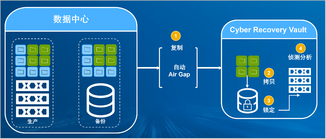 1929cc威尼斯(中国)防勒索病毒方案将生产中心备份数据复制到Vault区,复制后网络自动断开实现弹性隔离。Vault区的数据快速拷贝,并对拷贝版本加锁(在锁定期数据不允许删除和修改)。Vault沙箱内对拷贝版本进行扫描分析,验证数据是否完好。